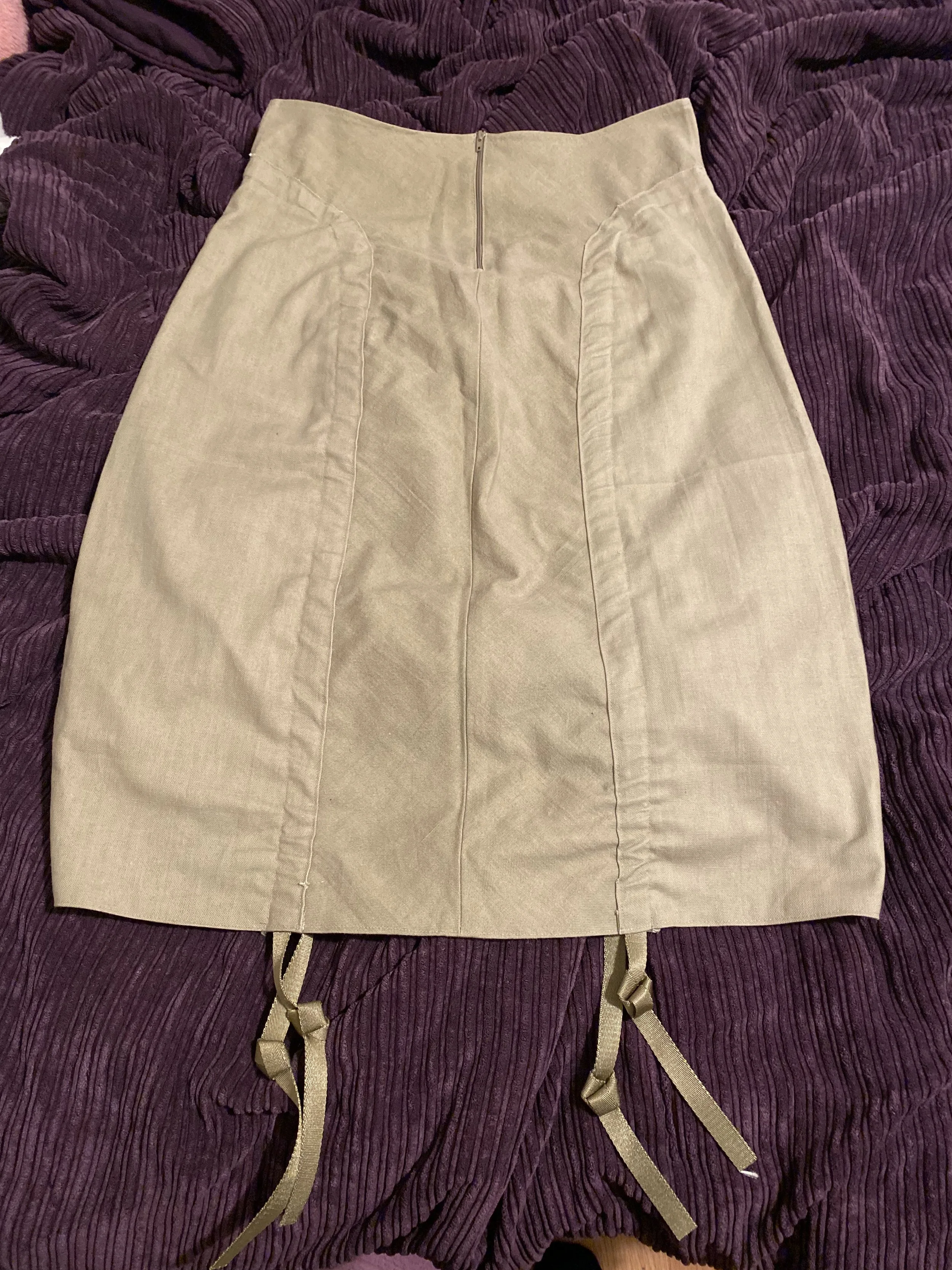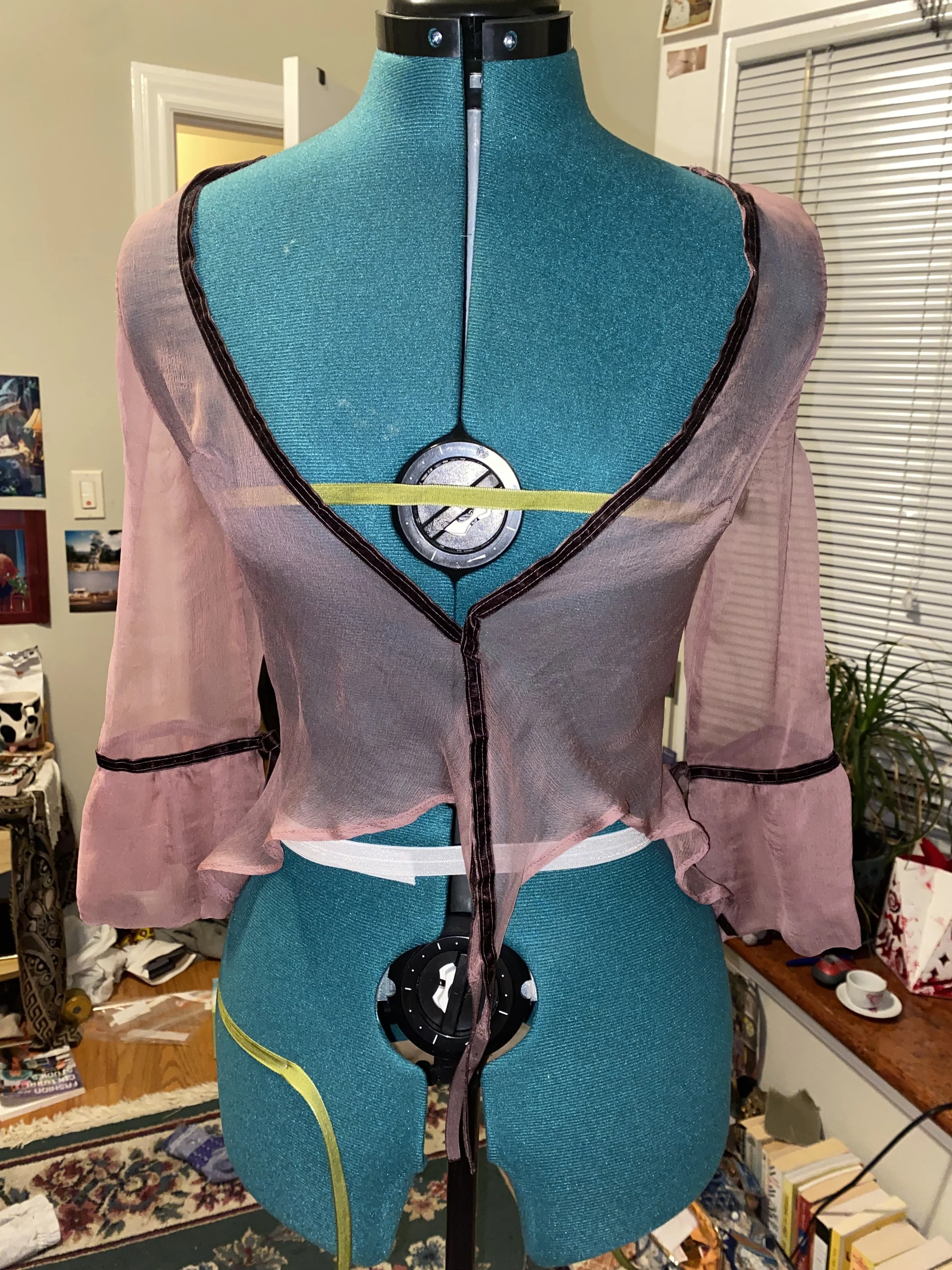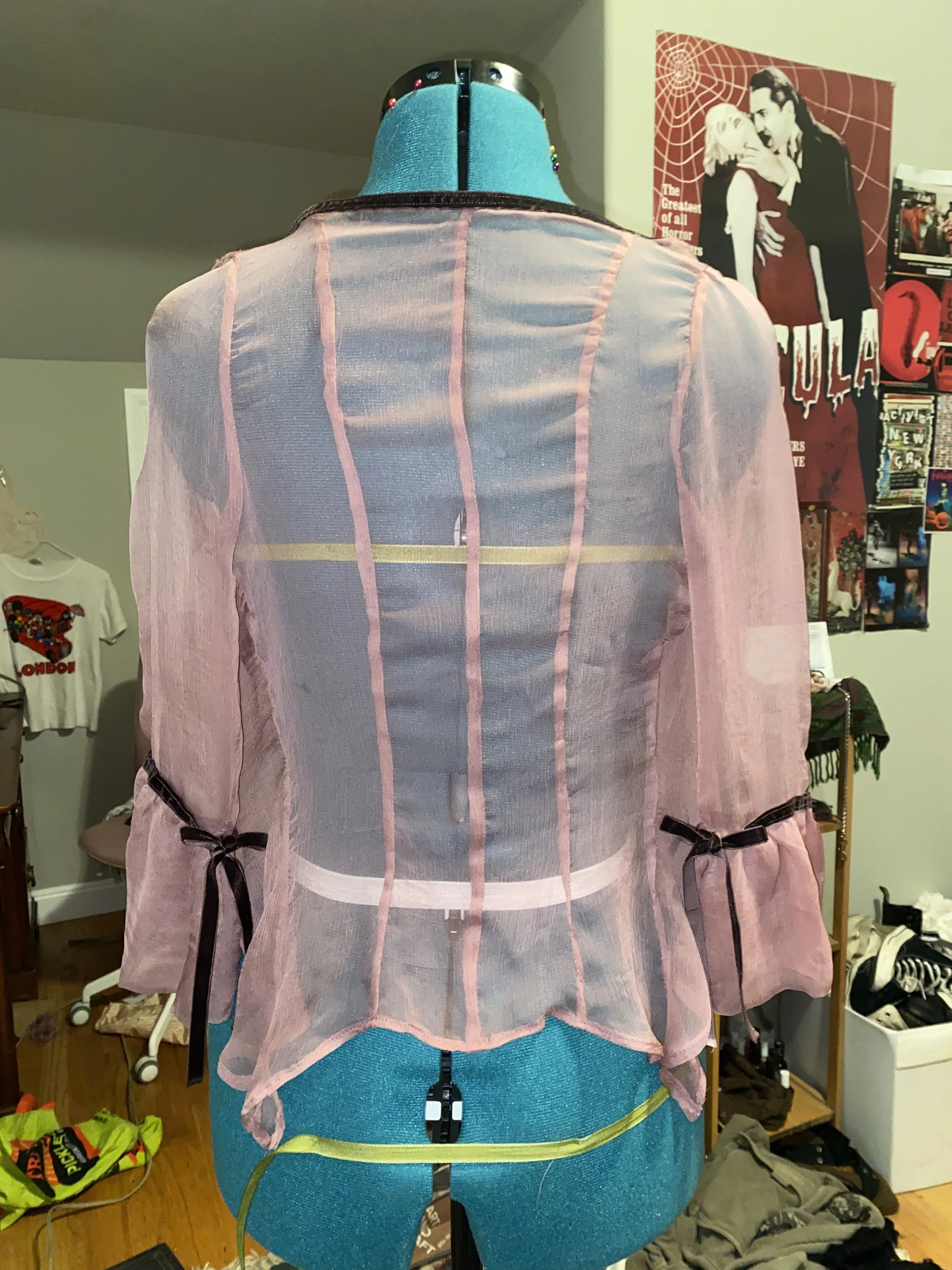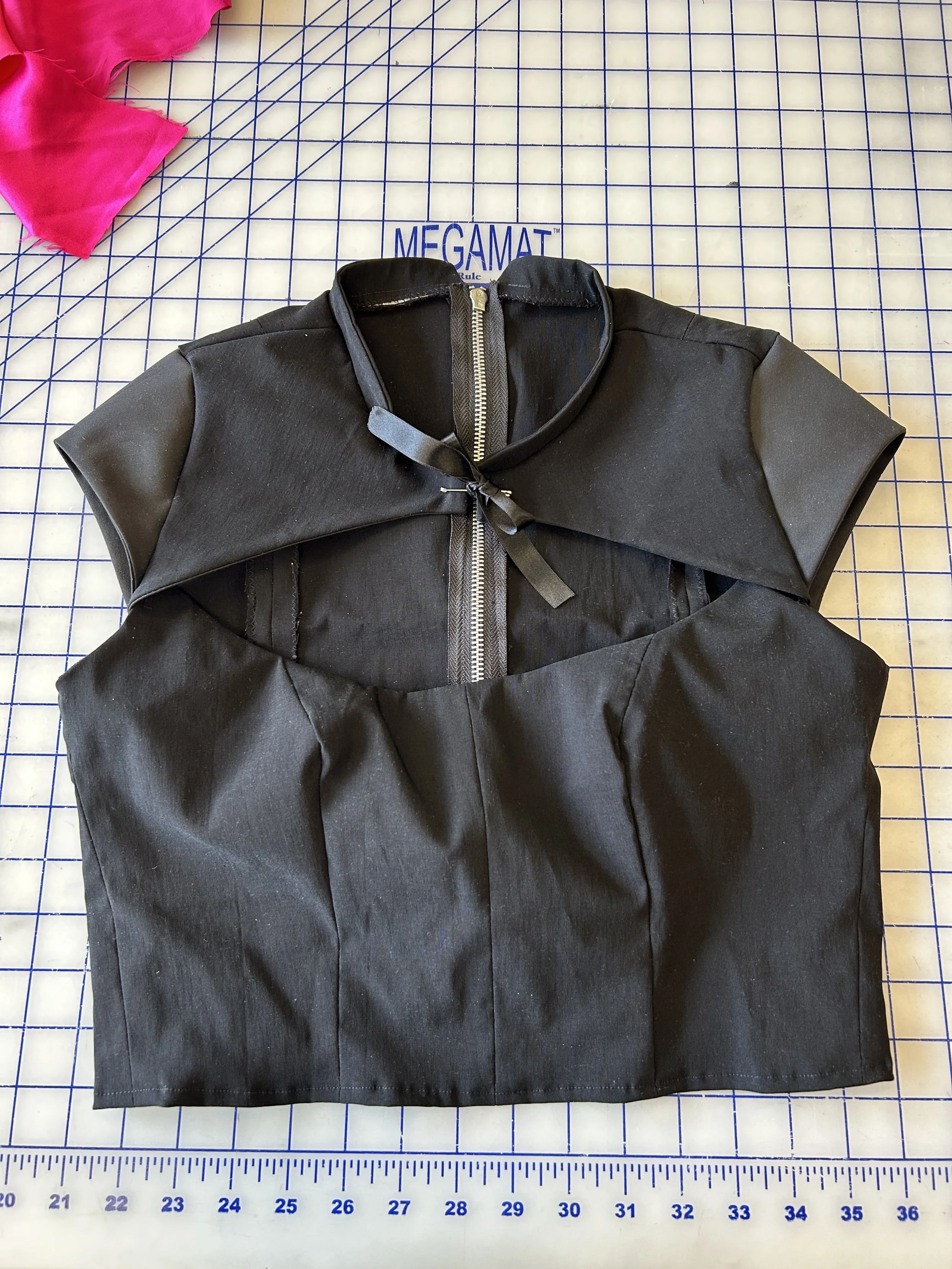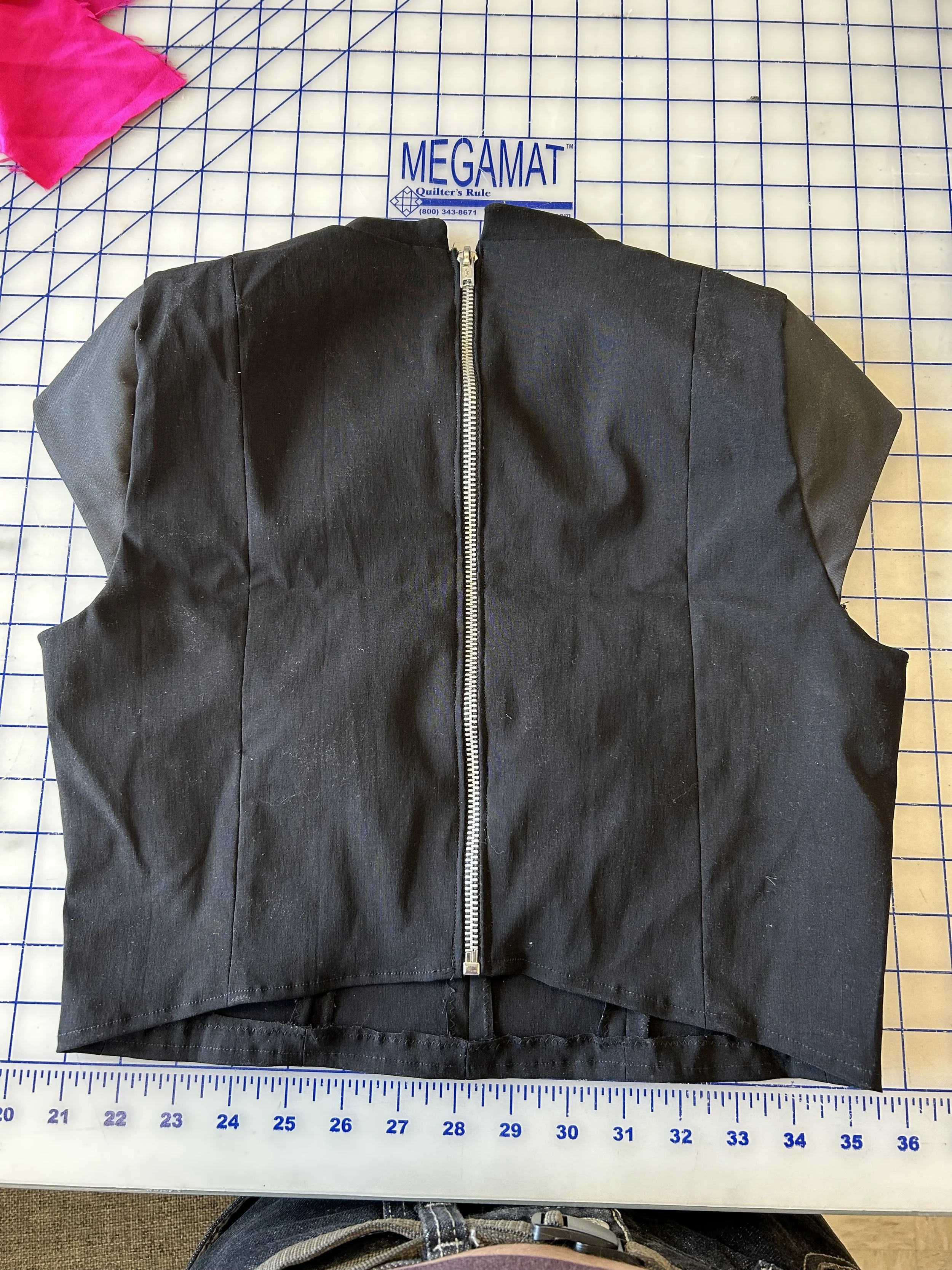 Transforming discarded clothes into a new garment. Business slacks were reworked into the peep-front ISABEL GRUNGE top.